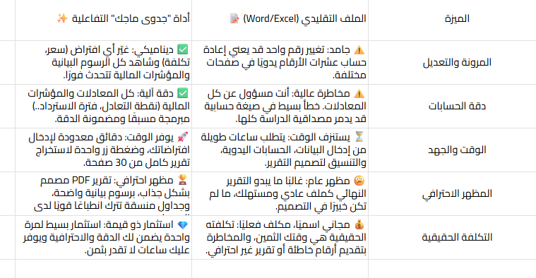 نموذج دراسة جدوى جاهز: مقارنة حاسمة بين ملف Word التقليدي وأداة "جدوى ماجك" التفاعلية