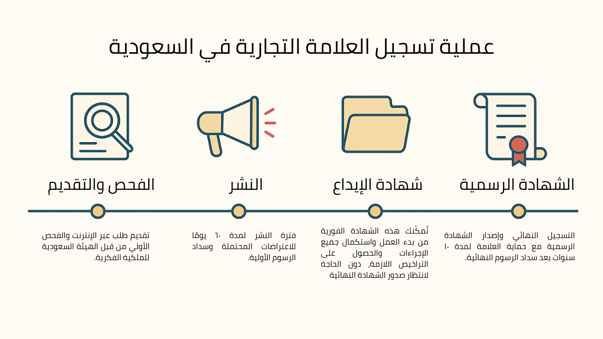 إليك المراحل الثلاث الرئيسية لرحلة تسجيل علامتك كما وضحتها الهيئة السعودية للملكية الفكرية: